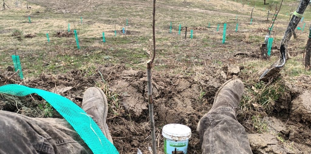Am mai lărgit puțin vetrele vișinilor plantați pe pante mai mari, ca să adune mai multă apă din cea care se scurge pe pantă și apoi am mai altoit câțiva dintre cireșii care au rămas nealtoiți de anul trecut din diverse motive, ori au fost prea mici, ori nu s-au prins altoii.